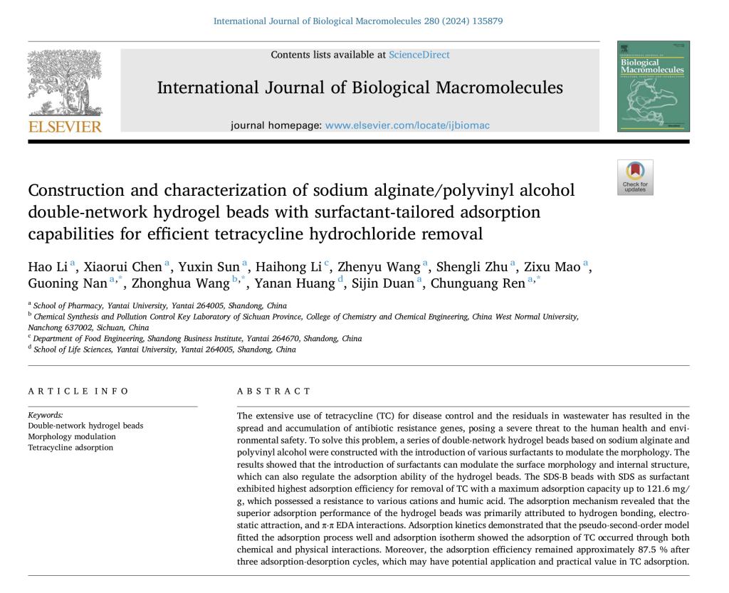 近日,独播库 2021级生物制药专业本科生李浩为第一作者,独播库 教师任春光、南国宁以及西华师范大学王中华教授为共同通讯作者,以“基于表面活性剂调控的海藻酸钠/聚乙烯醇双网络水凝胶微球的制备及其对四环素盐酸盐高效吸附性能的研究”为题,在国际权威期刊《国际生物大分子杂志》(中科院一区TOP)发表研究论文。