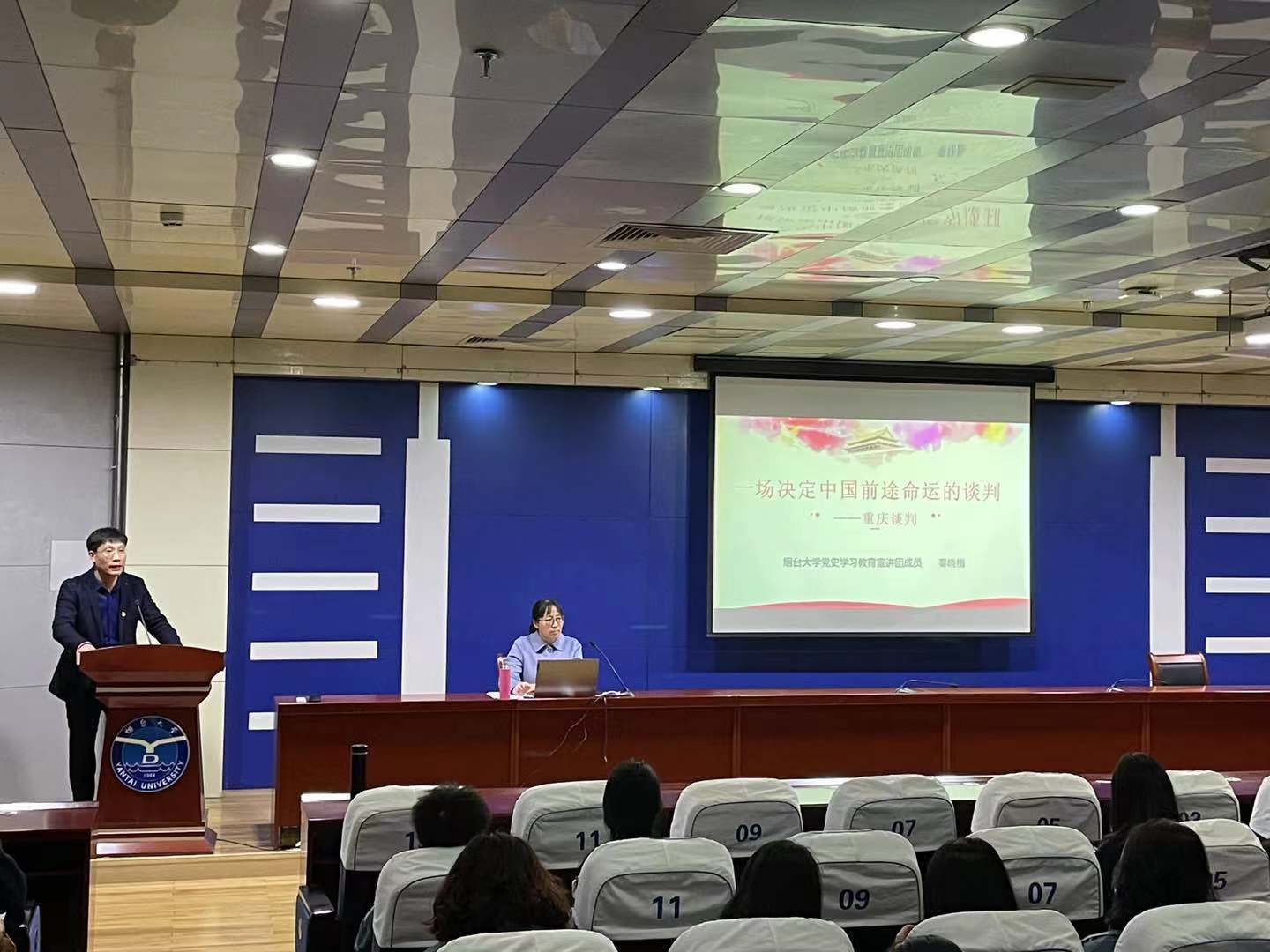 当日下午,独播库 教工党支部、研究生党支部、本科生党支部与学校图书馆第一、第二党支部开展校内共学活动,共同邀请了独播库 党史学习教育宣讲团秦晓梅老师做题为“一场决定中国前途命运的谈判——重庆谈判”的报告,独播库 党总支副书记张立明主持了报告会。下一步,双方党组织将继续以共学共建提升党史学习教育的实效,真正做到学党史、悟思想、办实事、开新局。