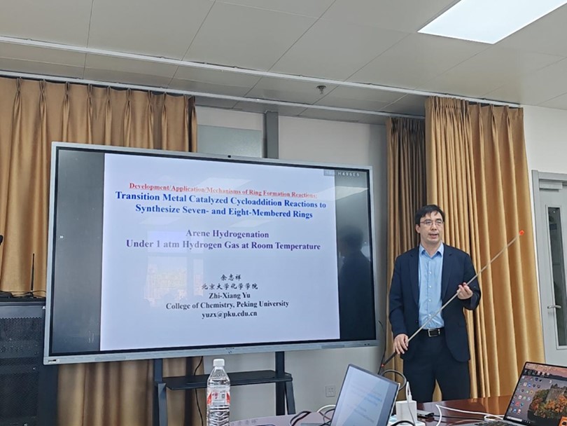 余教授以“成环反应的发展/应用/机理研究以及常温常压下芳环氢化反应的发现”为题,详细介绍了成环化合物在医药和生物领域的应用,指出了合成环状化合物领域内的目前存在的相关挑战,并汇报了其课题组自成立以来围绕成环反应发展和应用及其机理研究所开展的系统研究工作。此外,余志祥教授倾情分享了他研究[5+2+1]成环反应机理的心路历程,历经十七年在计算化学得到发展的条件下终成功,给予了在场同学坚定科研之路的信心激励。