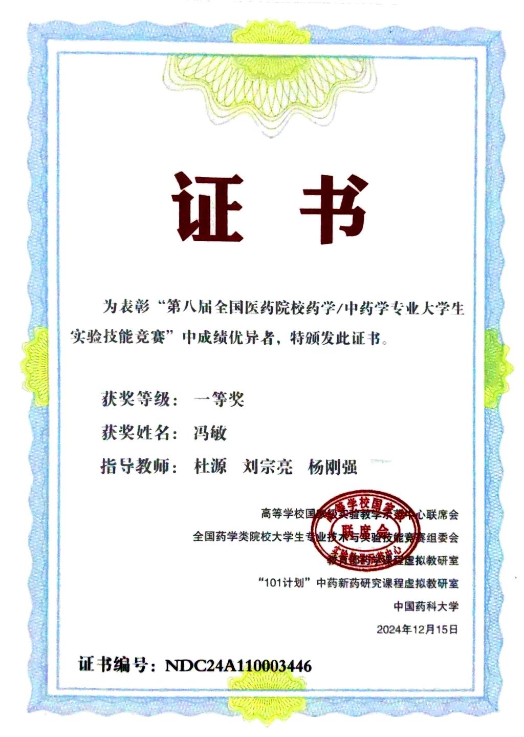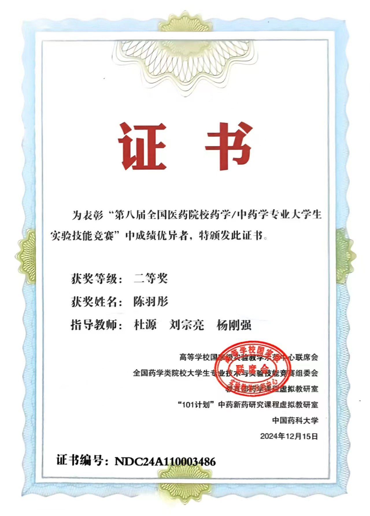 来自全国148所医药类院校288名选手参与此次活动。在竞赛现场,参赛选手们在规定时间内完成了一系列精心设计的实验项目,竞赛内容涵盖了药物分析、药物化学、药理学、中药鉴定等多个领域,不仅考验了学生们的基础理论知识,更重视实验操作技能和实践创新能力。选手们以饱满的热情和扎实的专业知识,展示了当代药学/中药学青年学子的风采。最终,我院学子冯敏斩获一等奖,陈羽彤获得二等奖。